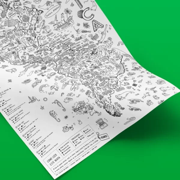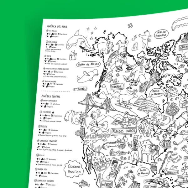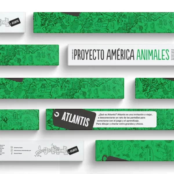 Además viene con unas interesantes indicaciones: Si están el peligro de extinción, su tiempo de vida, peso promedio y alimentación. Como siempre Atlantis pretende reunir a la familia o a los amigos alrededor del mapa, y comenzar a ¡pintar, conversar y aprender!