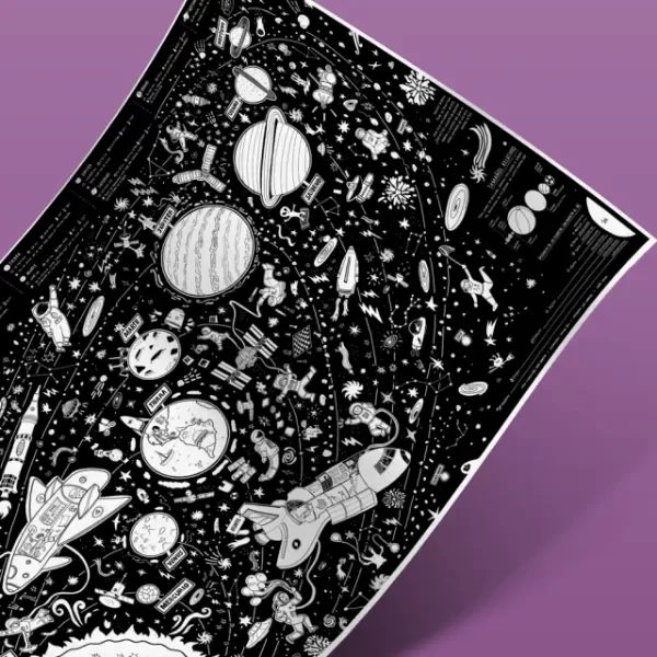 El Proyecto Sistema Solar es una lámina gigante en blanco y negro para colorear, con todos los planetas e información de cada uno de ellos en un viaje intergaláctico de color y diversión!
